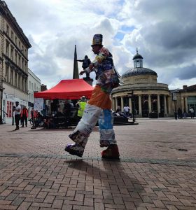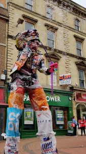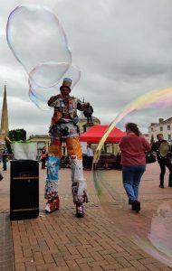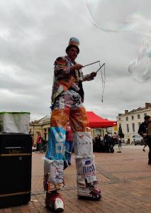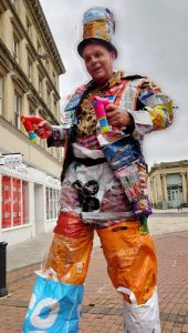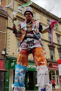July 2021 Bridgewater Quayside Festival walkabout with bubbles. The theme was about cleaning up the rivers and the environment so I made a new costume from discarded plastic bags, crisp packets and fastfood packaging debris. Photos: Luke Mann.
