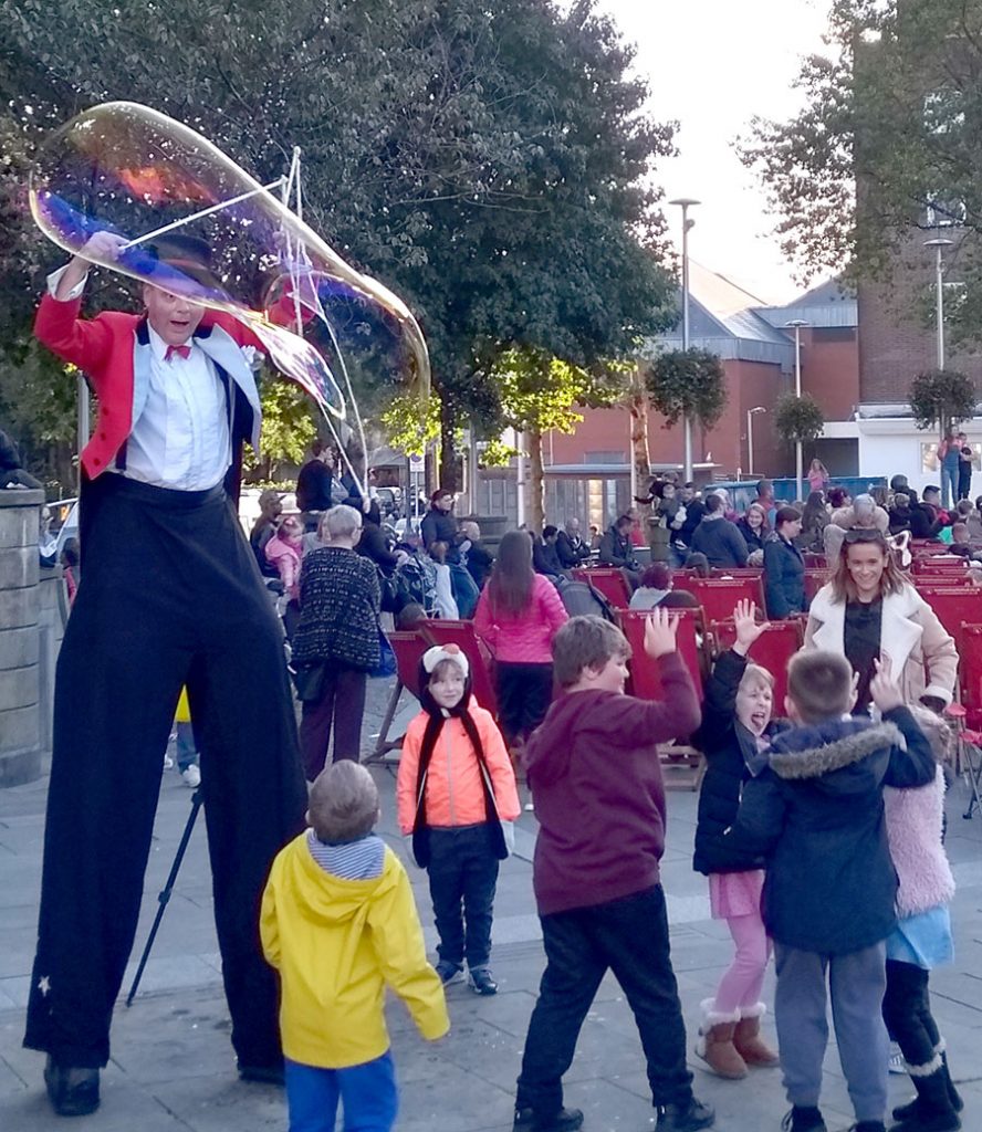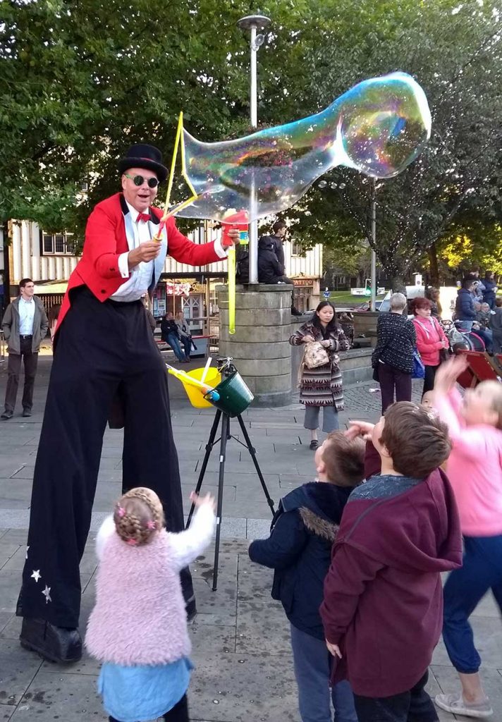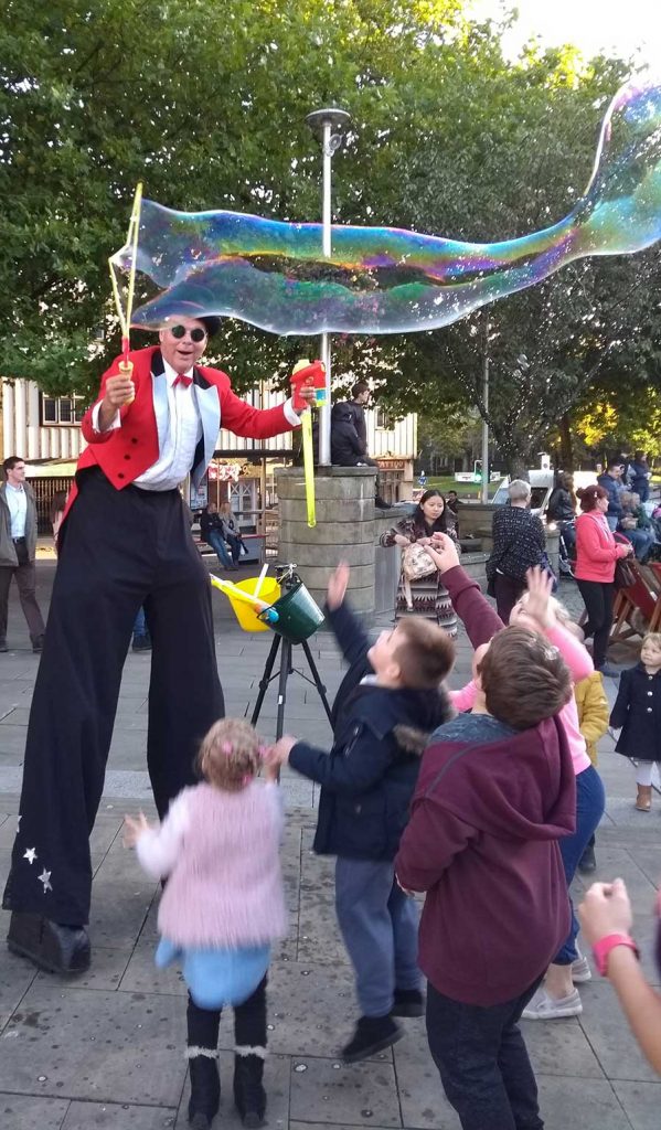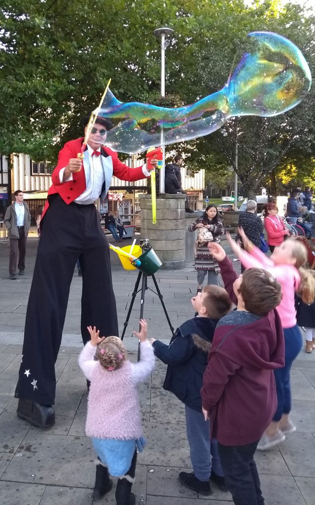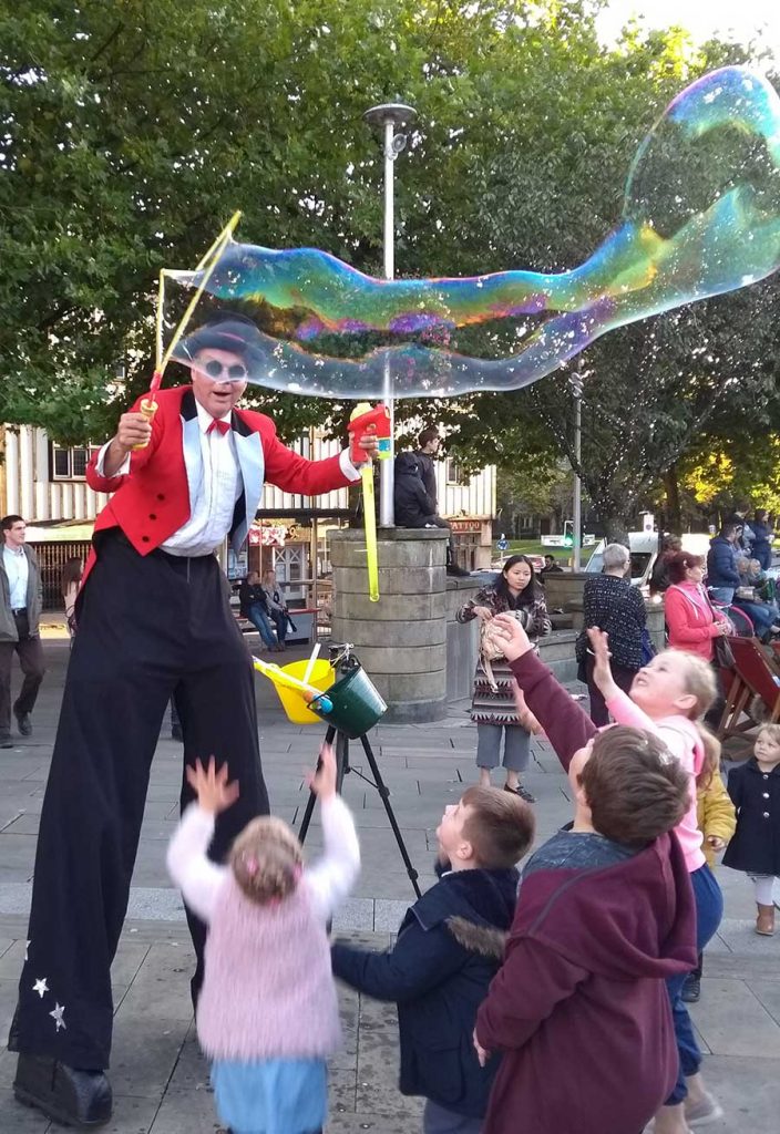 With Hat tricks the ideal welcoming character at the entrance to your event. Audience engagement, photos, dancing. Roving with Juggling, Giant Bubbles or Fire.