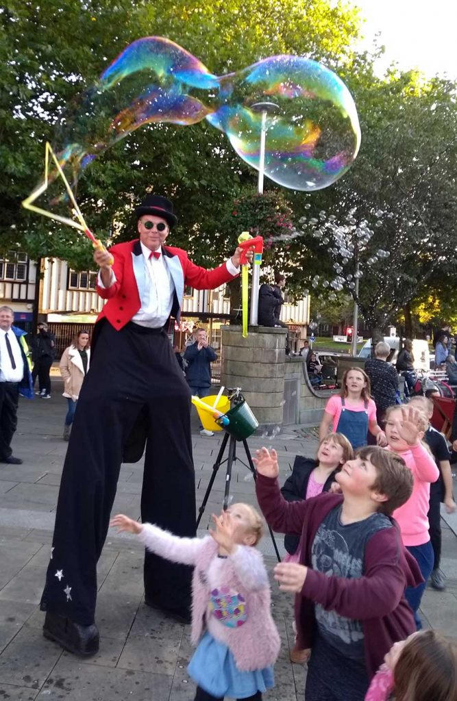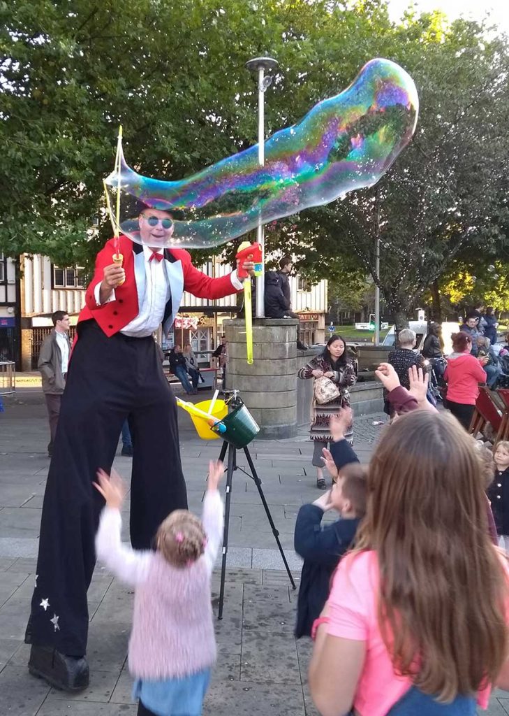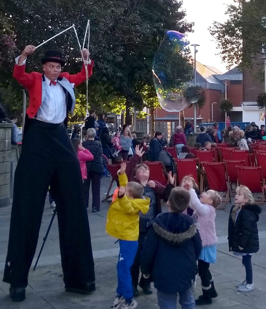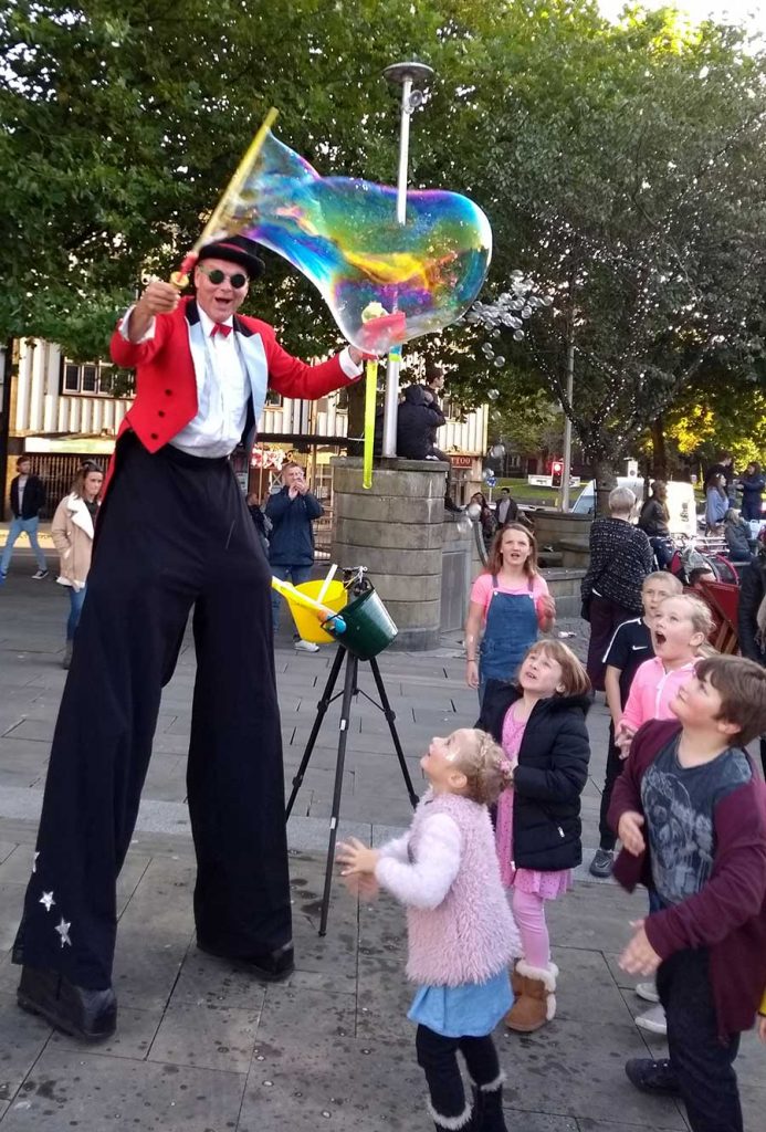 With Hat tricks the ideal welcoming character at the entrance to your event. Audience engagement, photos, dancing. Roving with Juggling, Giant Bubbles or Fire.